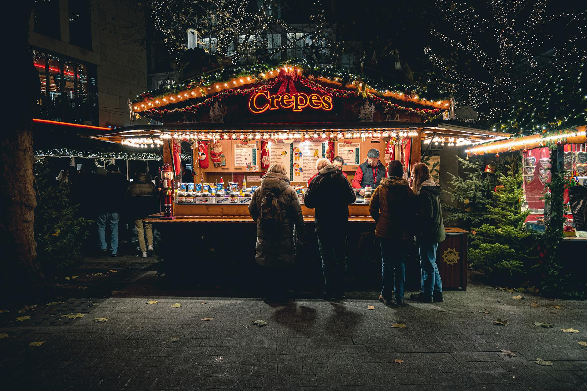 Oświetlone stoisko z naleśnikami na jarmarku świątecznym w Bielefeld